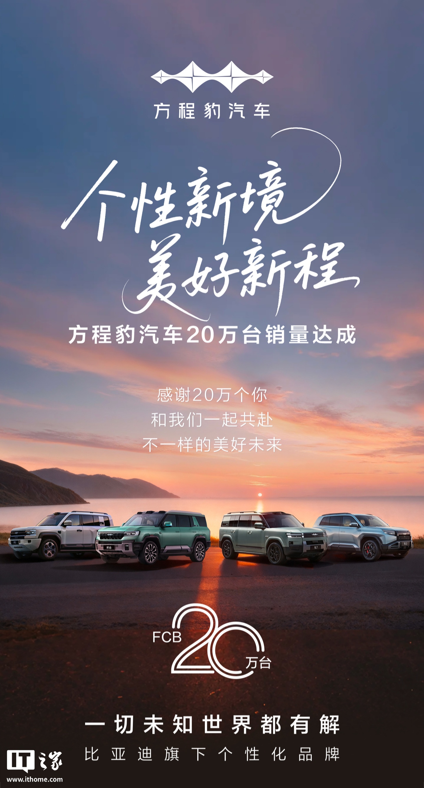 IT之家注意到,这一销量里程碑距离品牌达成 10 万台交付仅过去 5 个月时间,此前方程豹汽车在 2025 年 5 月 20 日宣布用时 18 个月达成 10 万台交付,成为新势力品牌中突破 10 万台交付用时最快 TOP3。